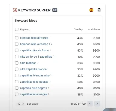 Keyword Surfer no solo te muestra el volumen de búsquedas de una palabra clave específica, sino que también te proporciona un conjunto de palabras relacionadas que pueden enriquecer tu estrategia de contenido.